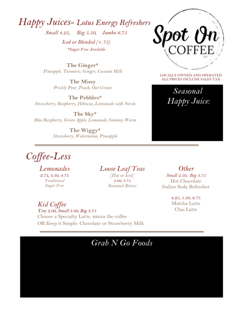 Spot On Coffee Menu